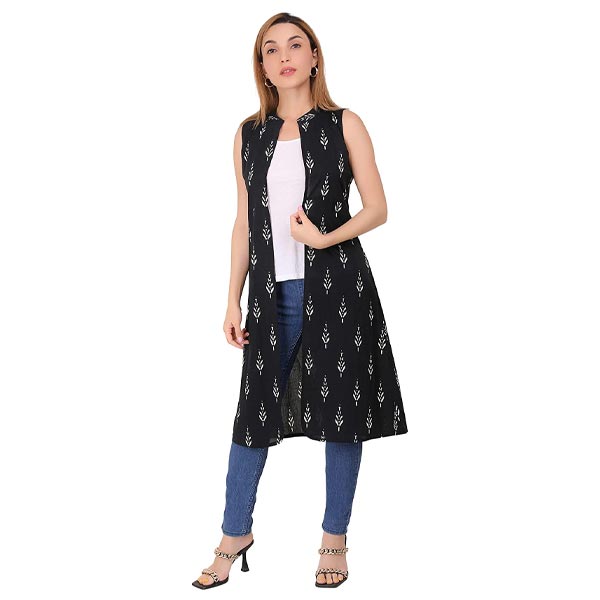 - This beautifully stitched shrug will make you star of the moment. It features floral printed on black color and made of soft cotton blend fabric. Pair it with a denim jeans, jegging or trouser for party and casual day out. Can also be work as an outer on ethnic kurta. A must have outfit in your collection. We have a good collection of tops, shrugs, kurtas.